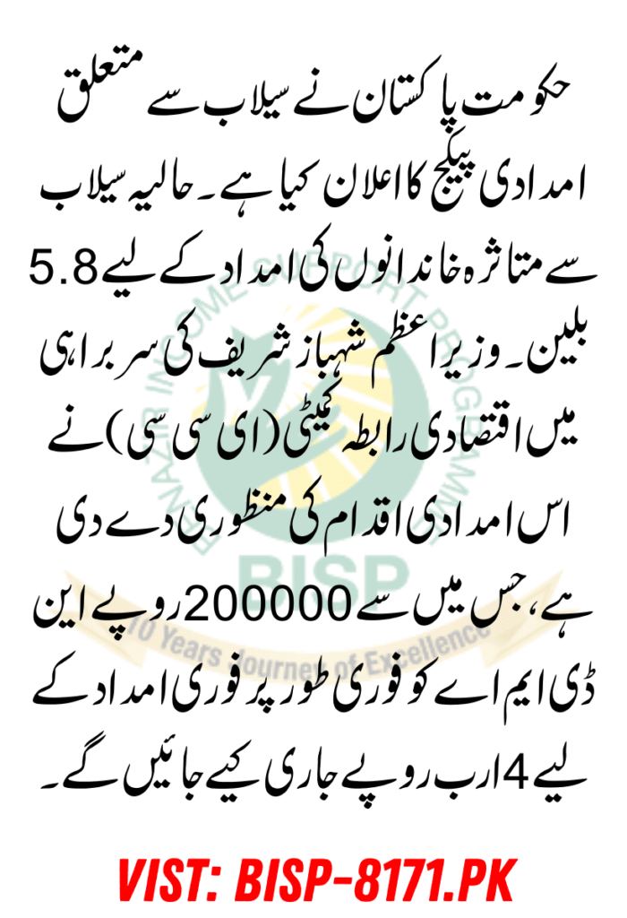 The Government of Pakistan has announced a flood relief package worth Rs. 5.8 billion to support families affected by recent floods. Under the leadership of Prime Minister Shabaz Sharif, the Economic Coordination Committee (ECC) has approved this relief initiative, out of which Rs. 4 billion will be immediately released to NDMA for urgent assistance.