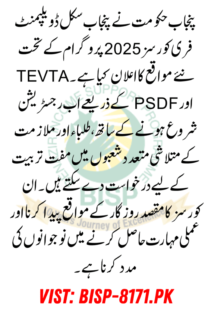 The Punjab government has announced new opportunities under the Punjab Skill Development Free Courses 2025 program. With registrations now open through TEVTA and PSDF, students and job seekers can apply for free training in multiple fields. These courses aim to create employment opportunities and support youth in gaining practical skills.